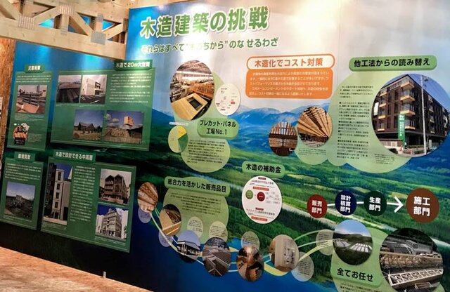 当社の大規模木造へのさまざまな取り組みを壁面全体を使用して展示致しました。当社の取り組みが一連の流れで分かるパネルのため、多くのお客様に足を止めて頂きじっくりパネルを御覧いただくことができました。