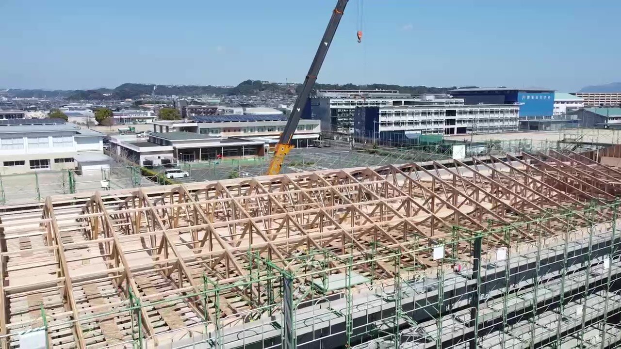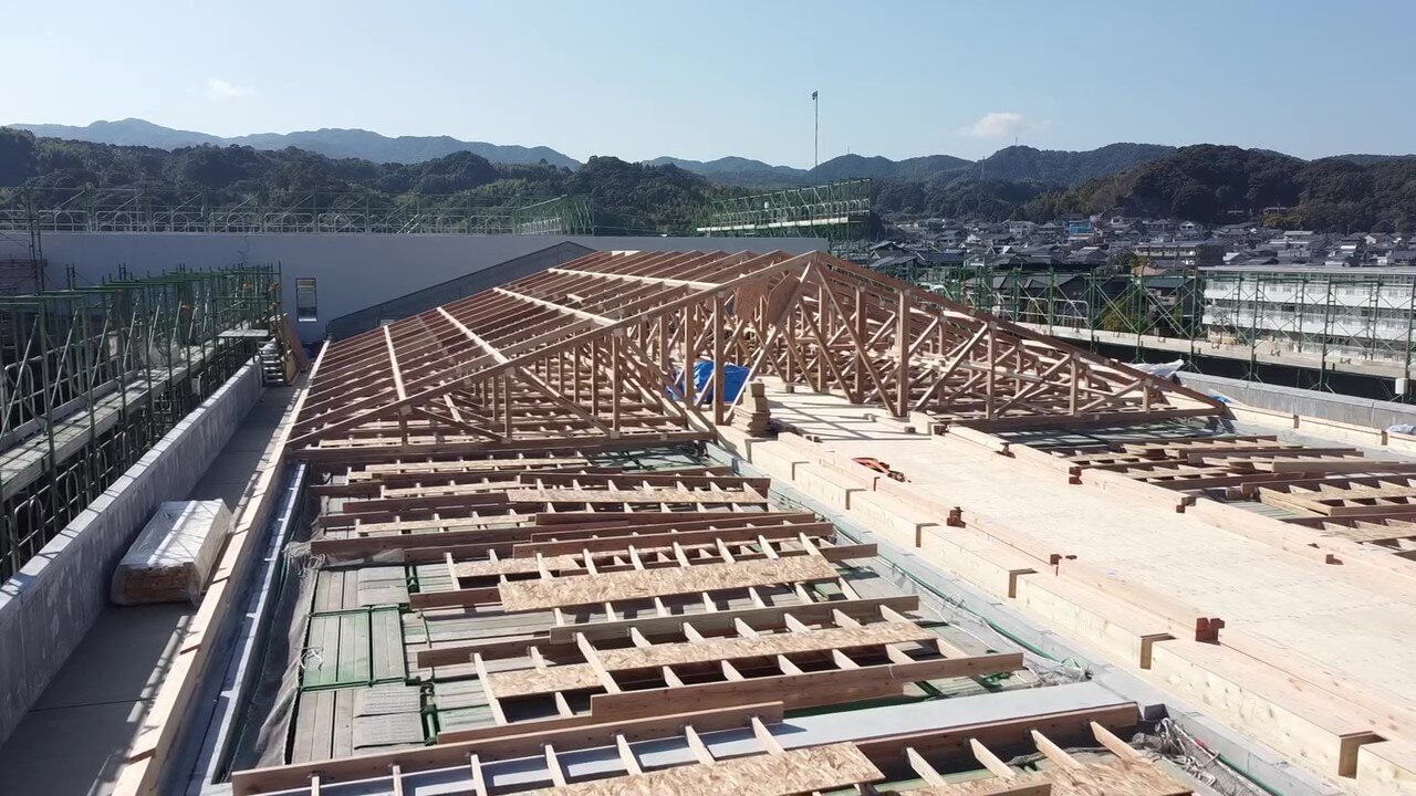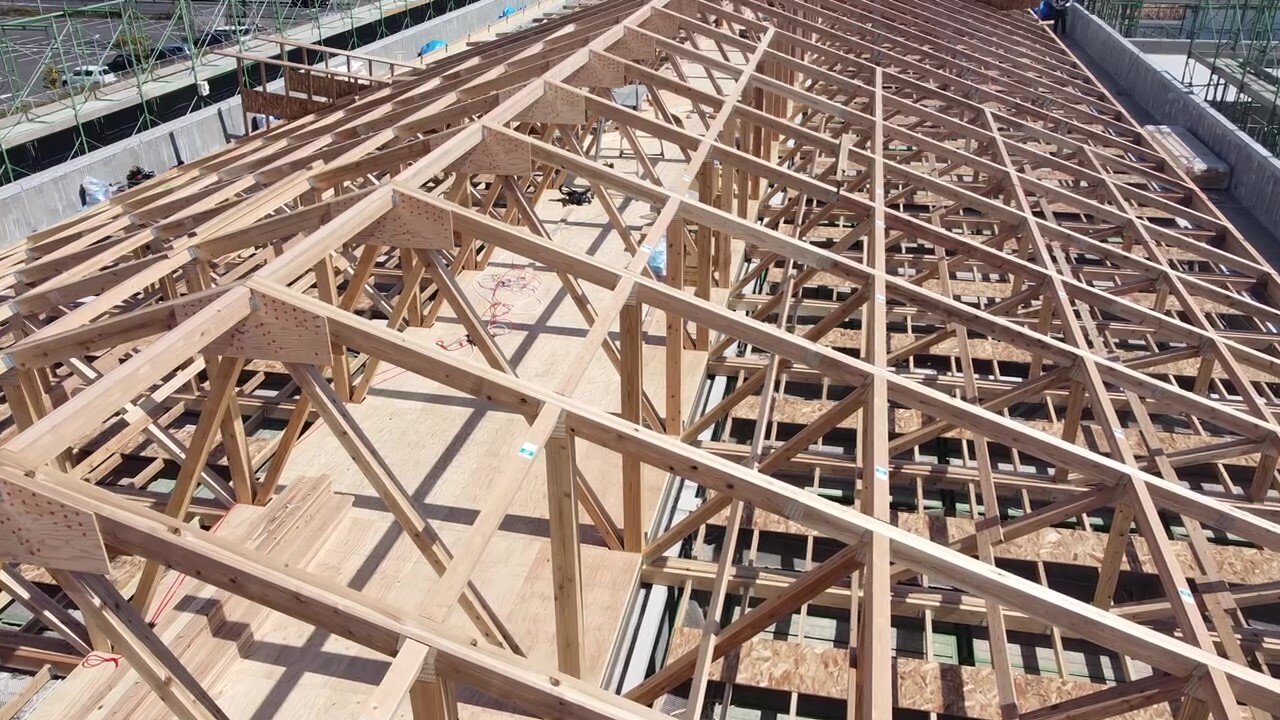①屋根組に鹿児島県産材スギ(JSⅡ)トラス採用、全858本