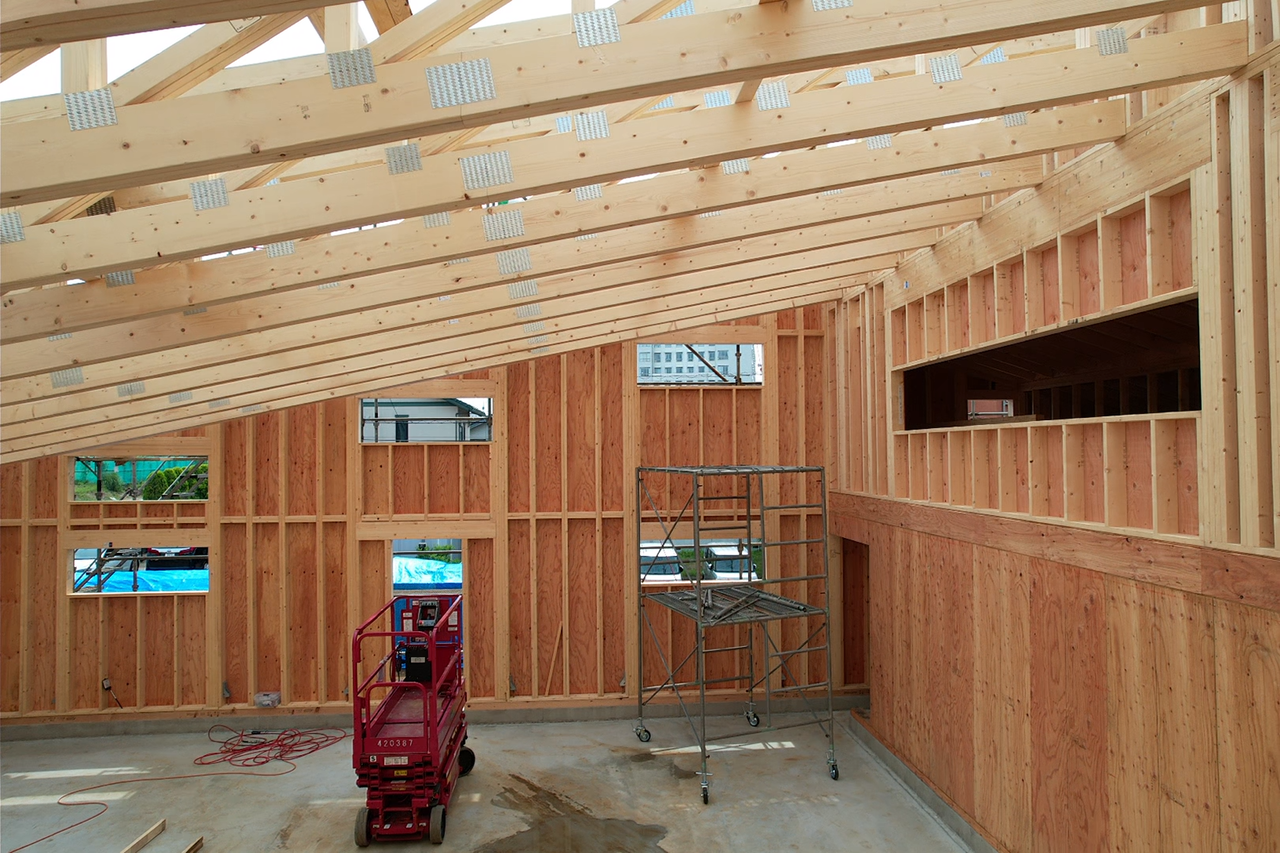 ①用途:倉庫&練習場 ②階数:平屋建 ③構造:枠組壁工法 ④規模:延床面積 299㎡(90坪)
