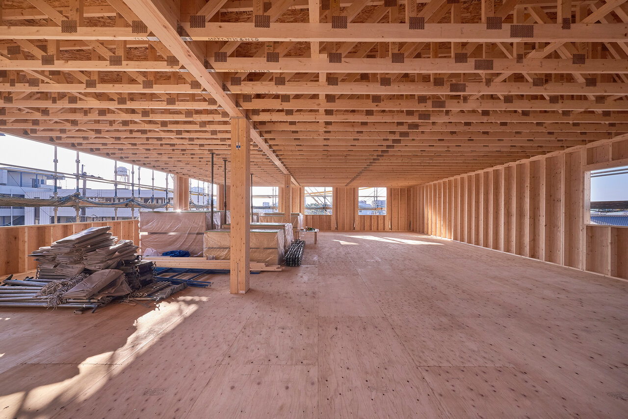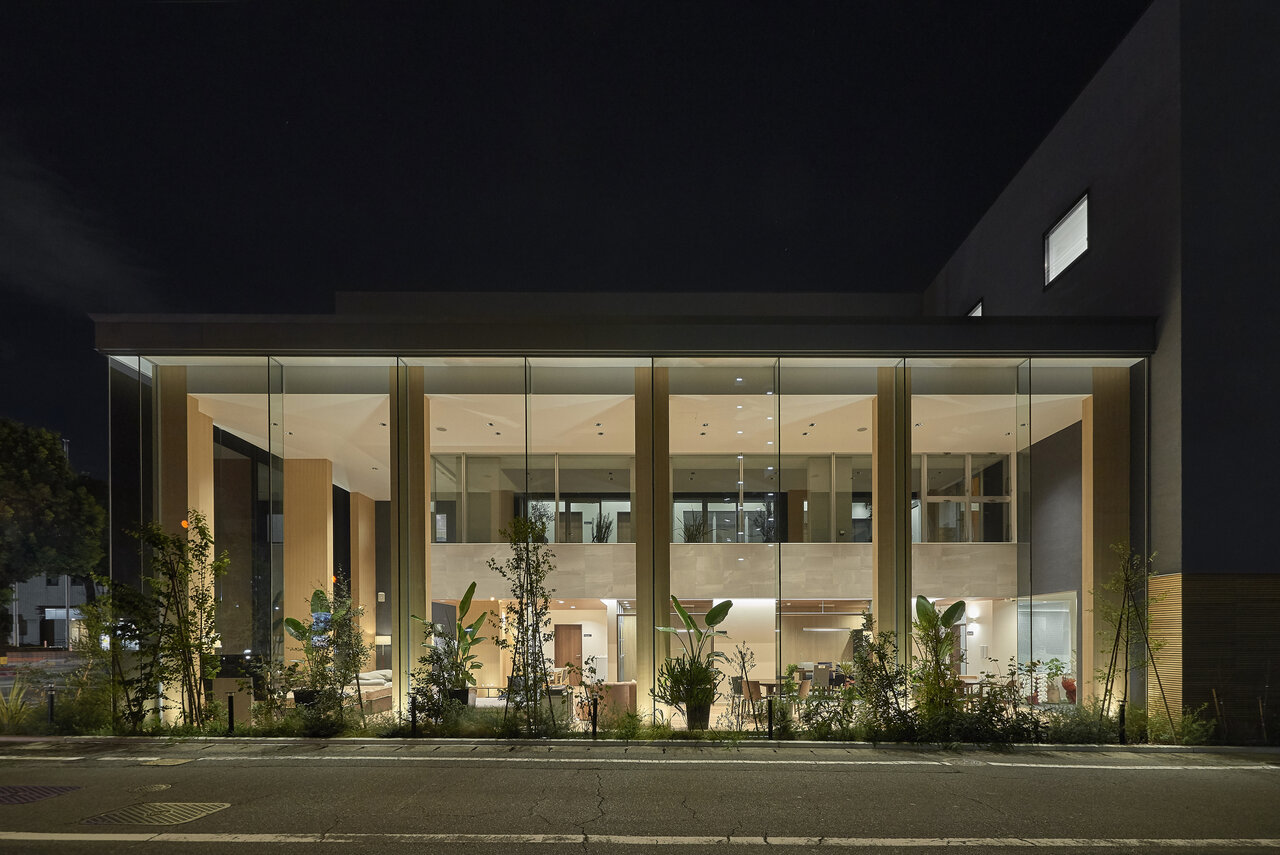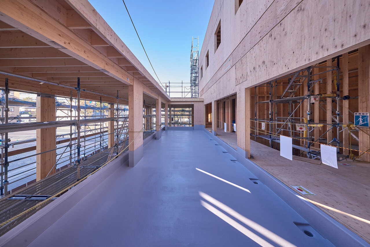 ・外壁大開口ガラスカーテンウォール+吹抜用木質ラーメン連窓