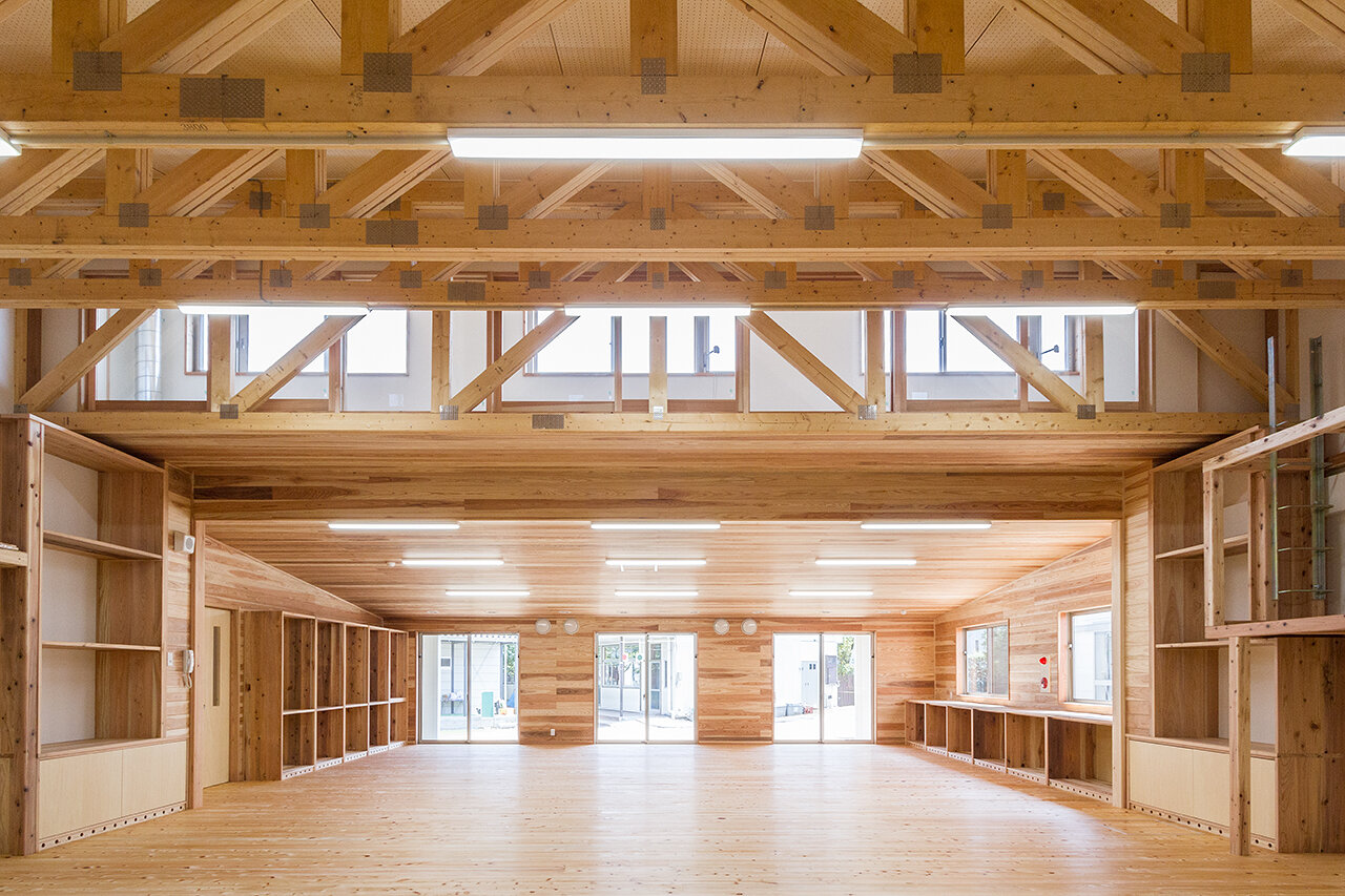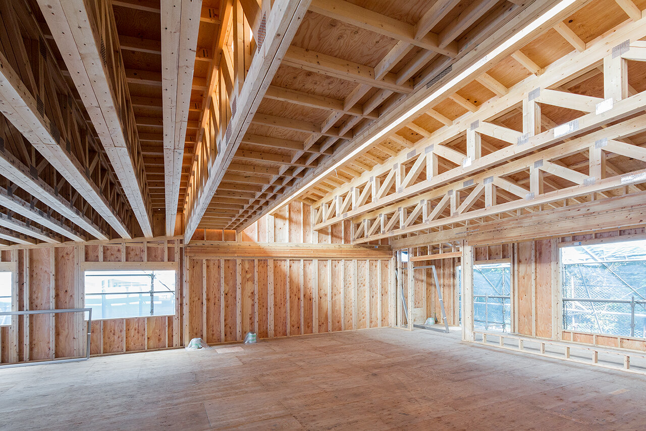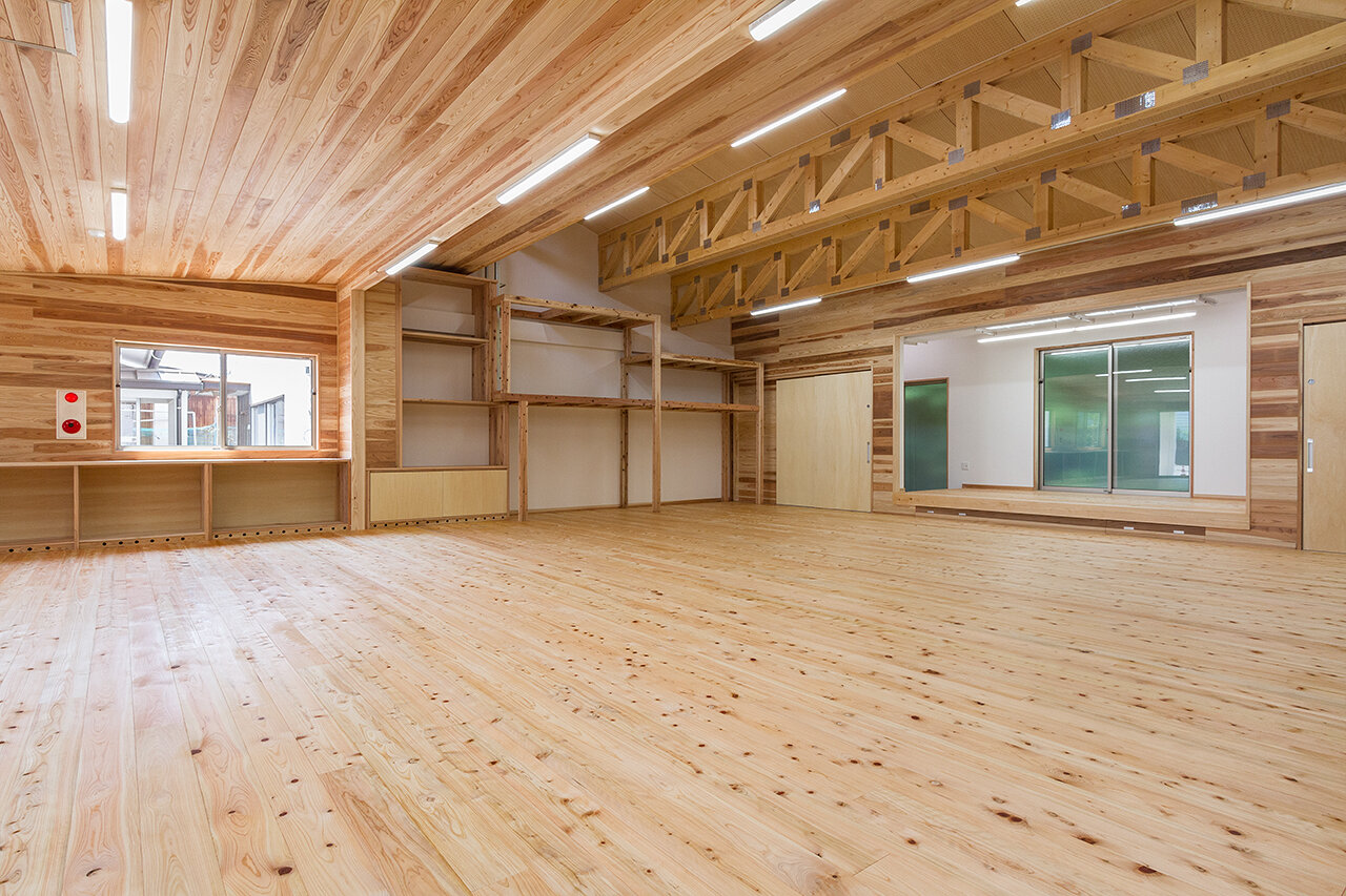 千葉県産スギ材利用(トラス・縦枠) 内装にも国産材利用 梁トラススパン6.4m、10m二点支持
