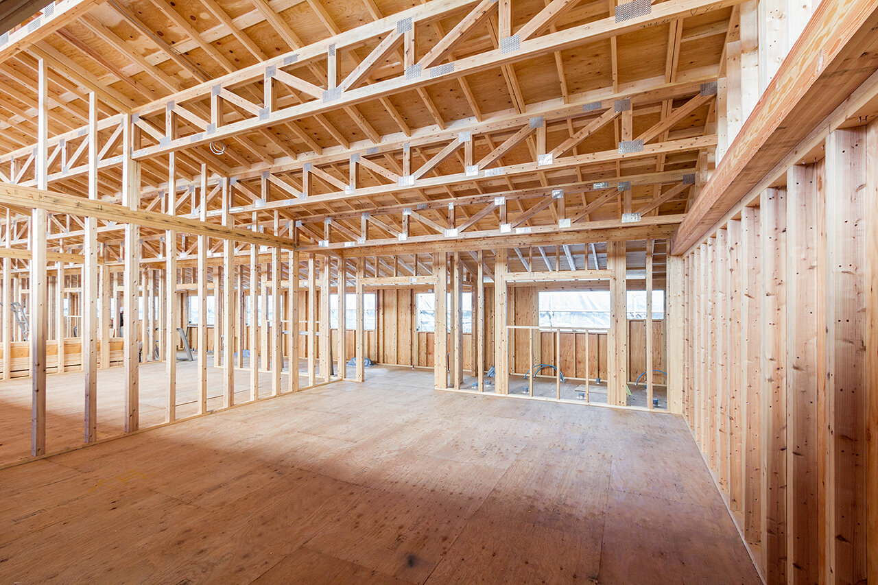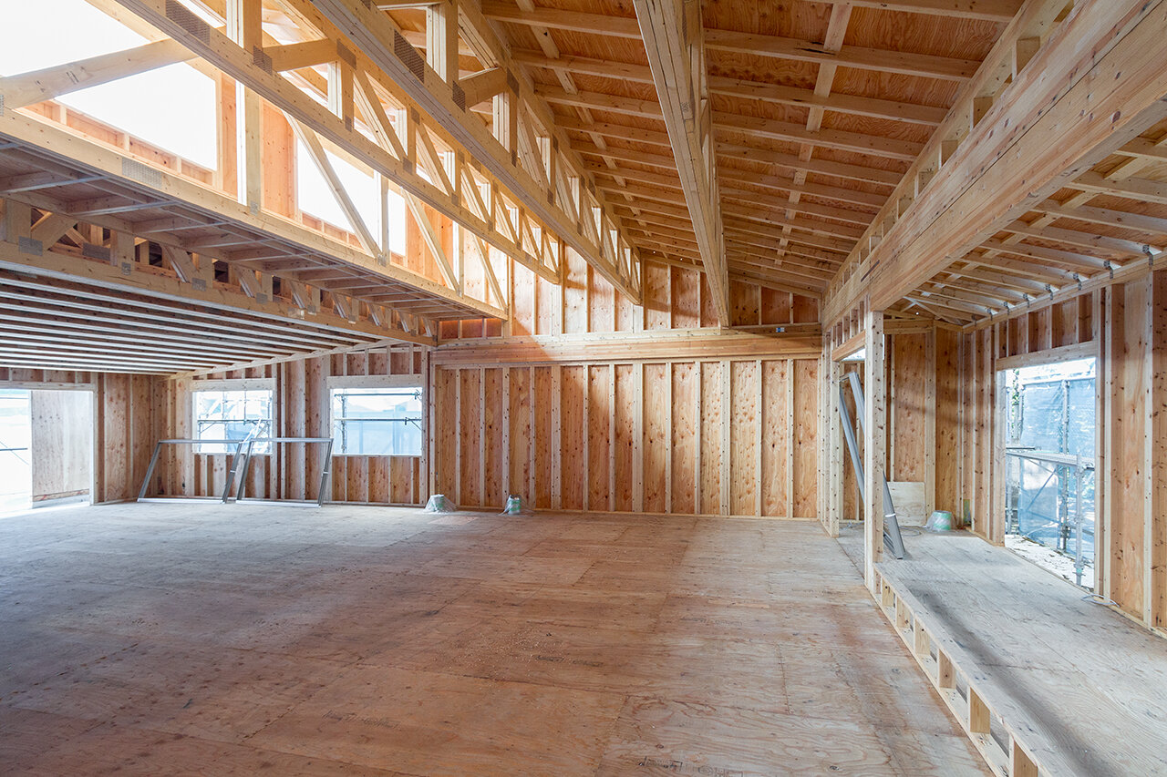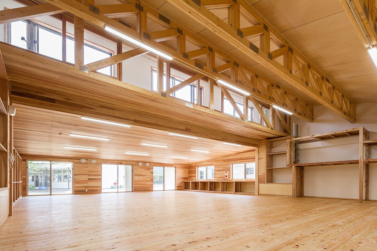 千葉県産スギ材利用(トラス・縦枠) 内装にも国産材利用 梁トラススパン6.4m、10m二点支持
