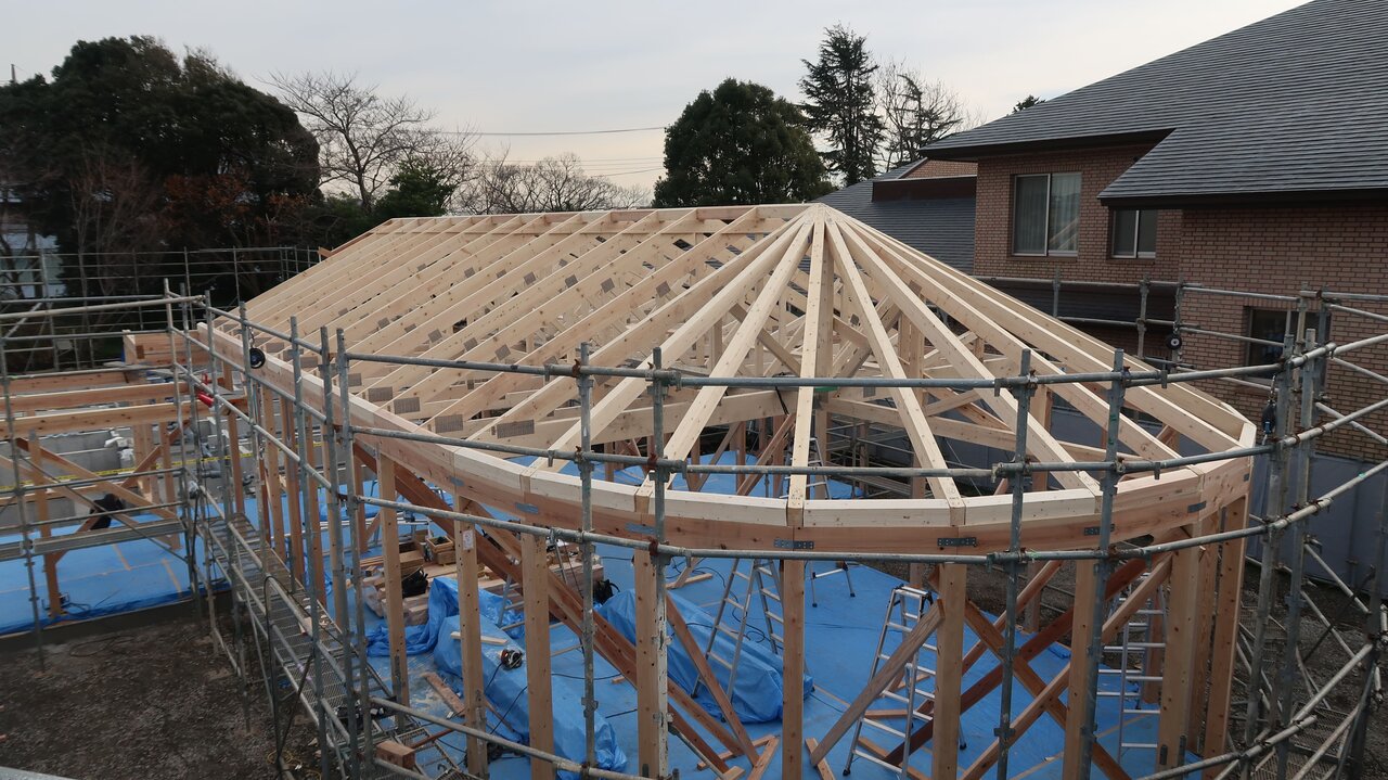 ・多角形アール屋根(24角形)をトラスとプレカット集成材たるきにて構成