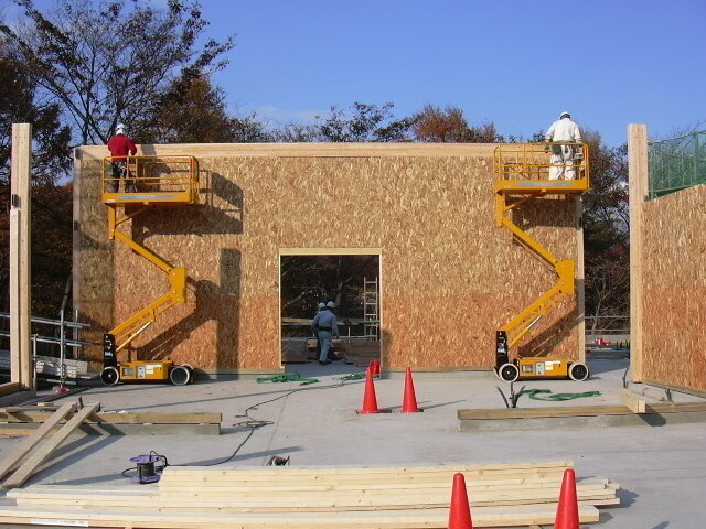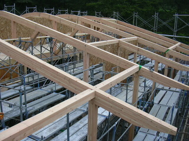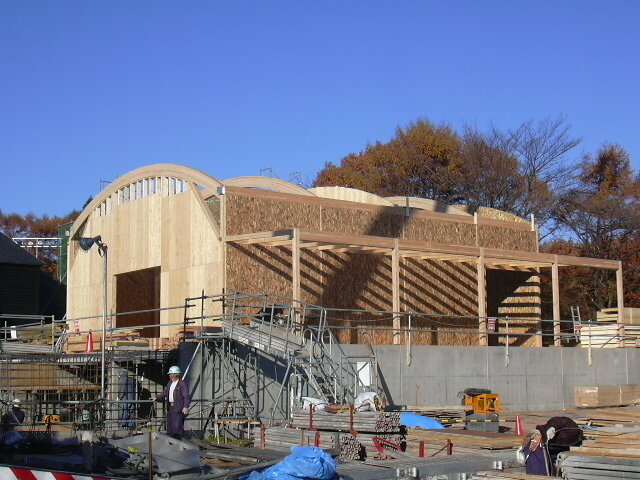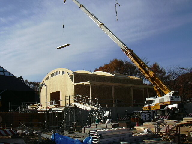 ・アール型屋根を 集成材曲梁とダブルシールドパネルにて構成しています。 -