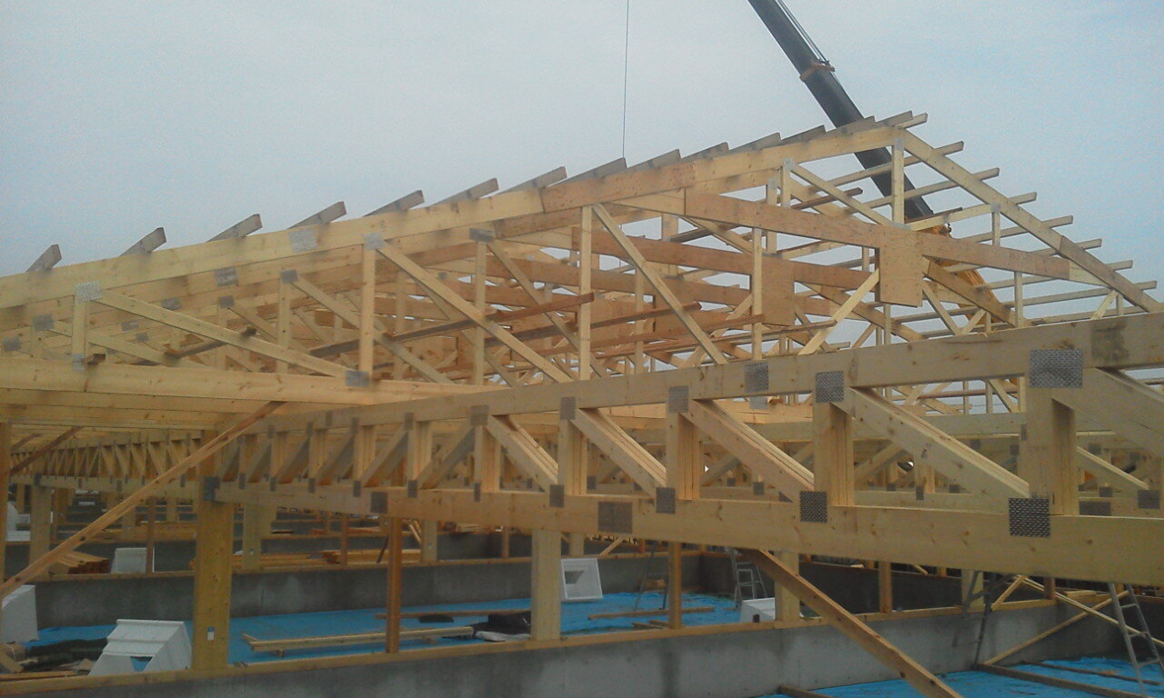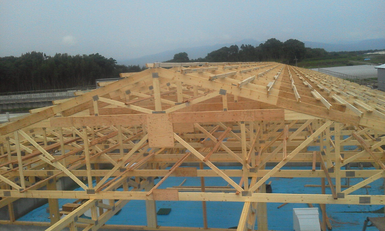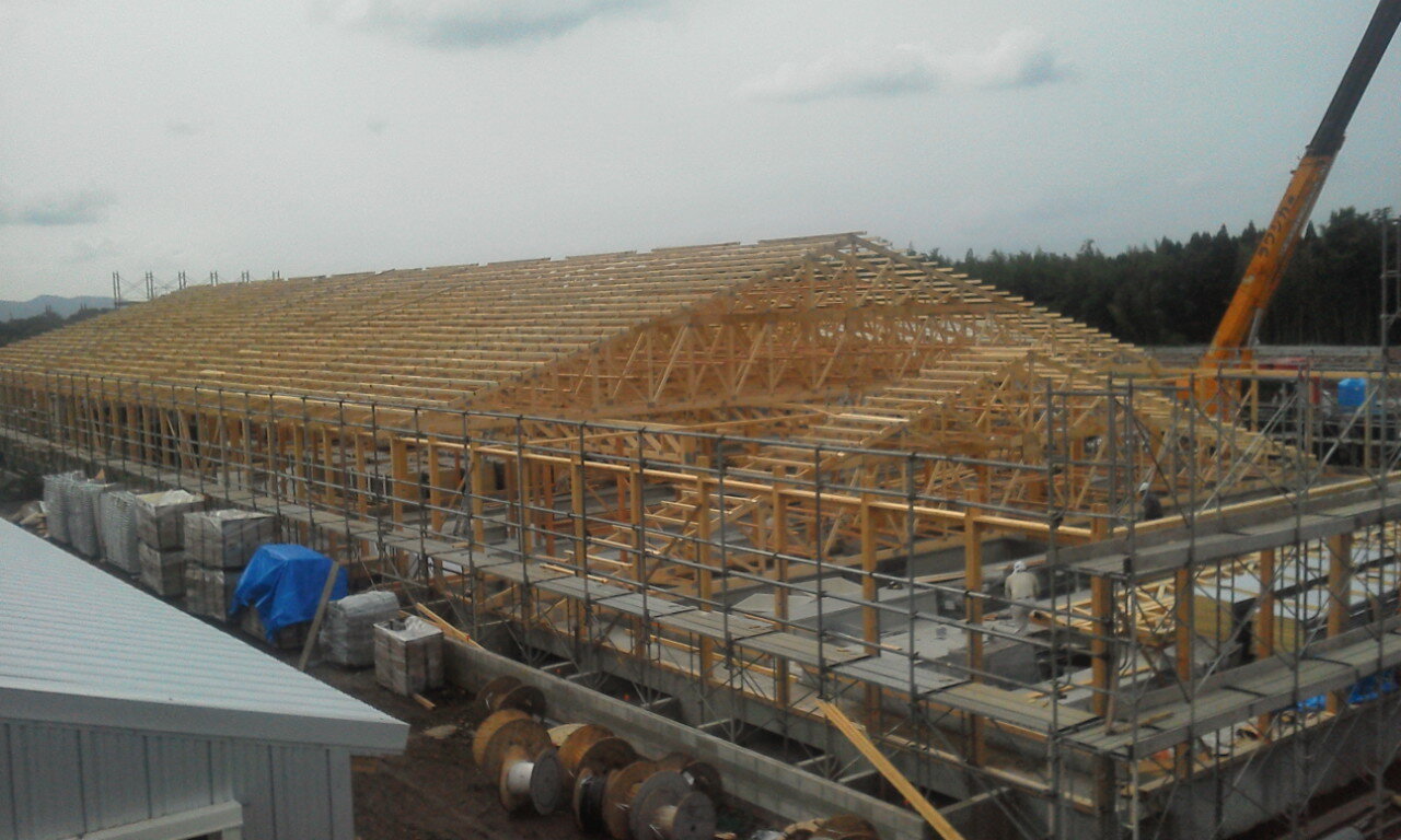 平行弦トラス + 屋根トラスにて大空間を実現