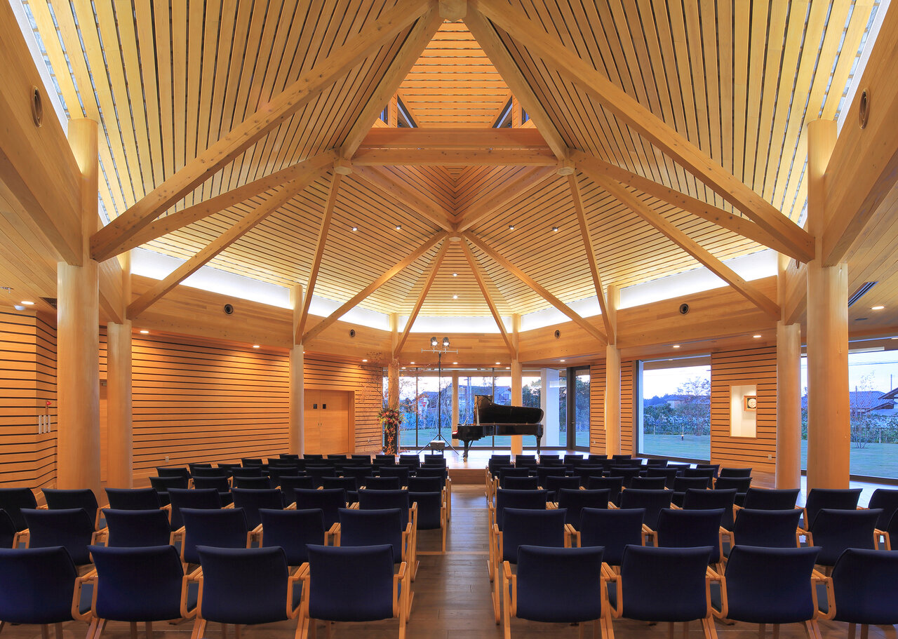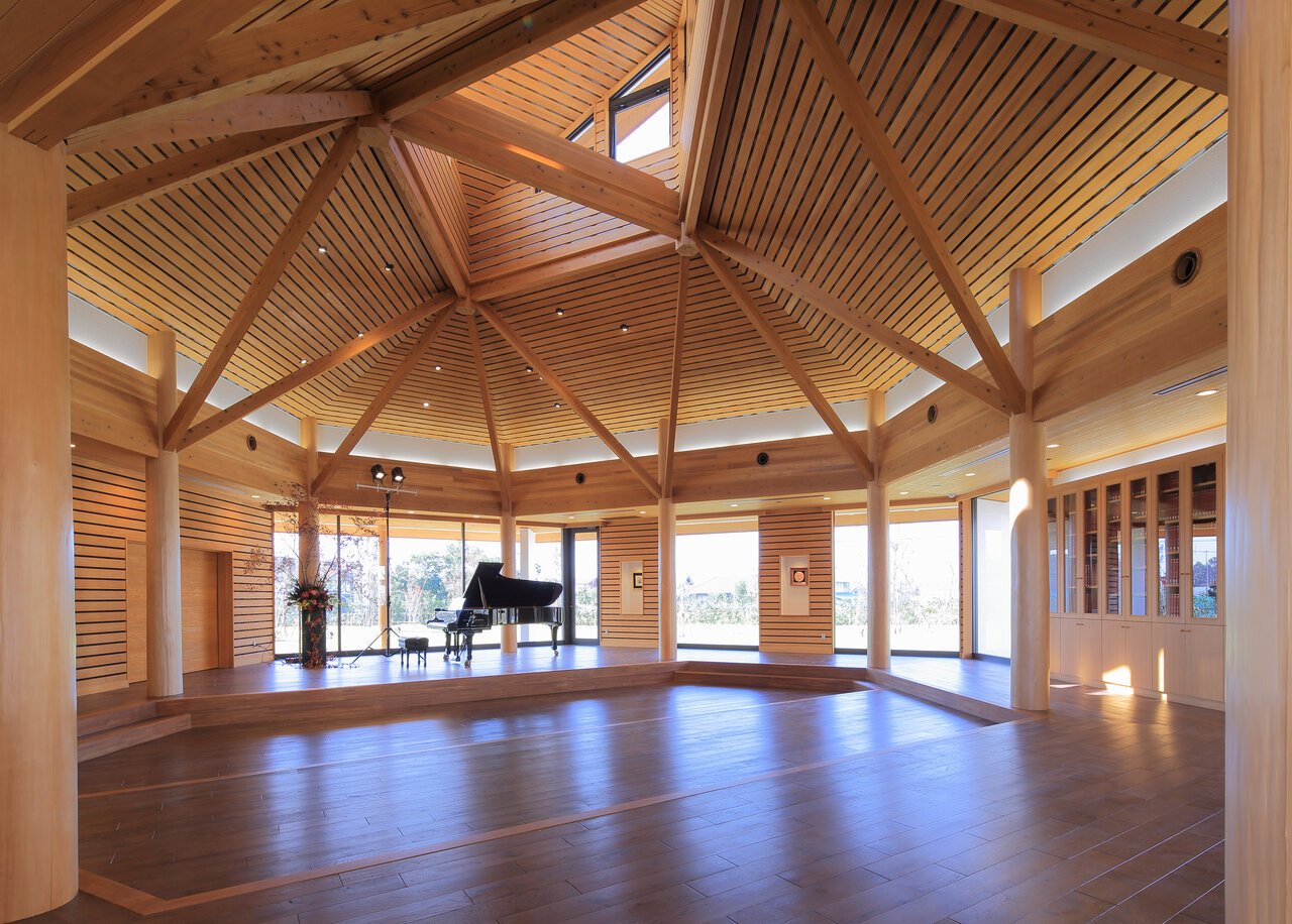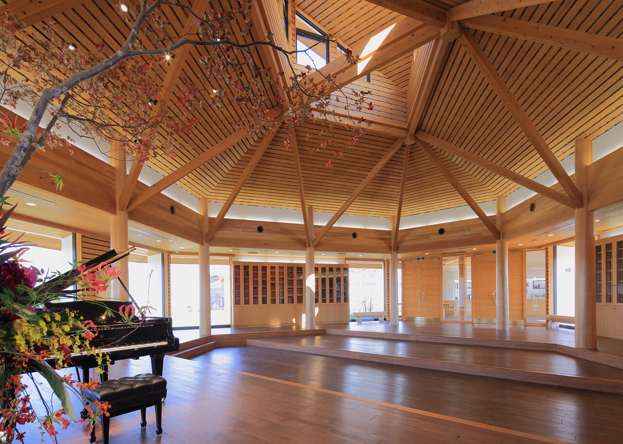 ・ホール中央ハイサイドライト部は、伝統的木造仕口:かぼちゃ束 を用いています。