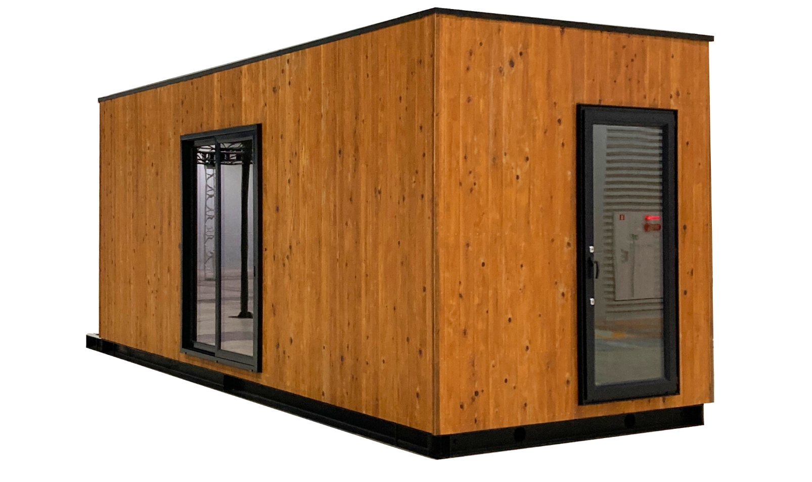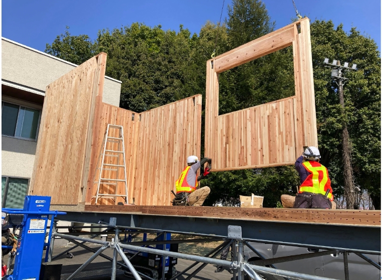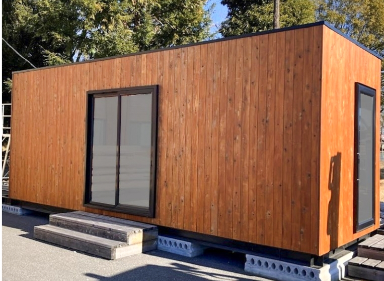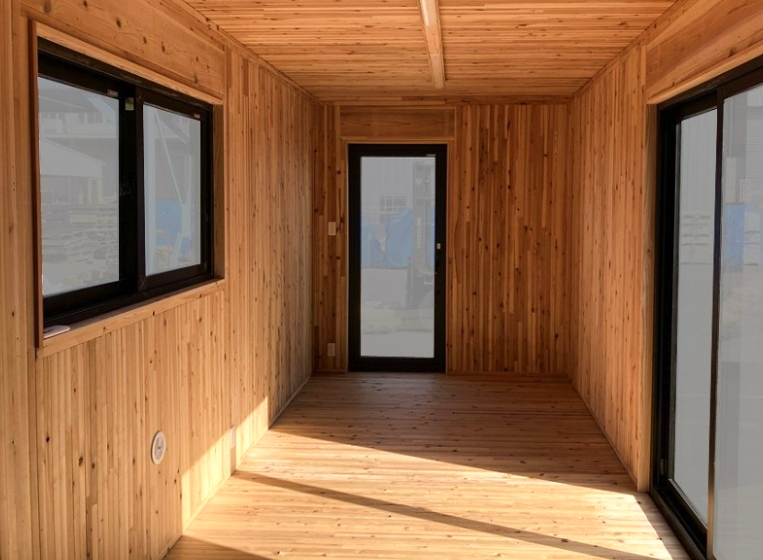 NLTコンテナは、枠組壁工法用製材を釘接合した集成板「NLT」を構造材に用いた木造コンテナです。木材の調湿性・断熱性を活かした環境性能と自由な設計が可能な点が特徴です。再利用性が高く、国産材の利用も可能なため、持続可能な社会の実現に大きく貢献します。