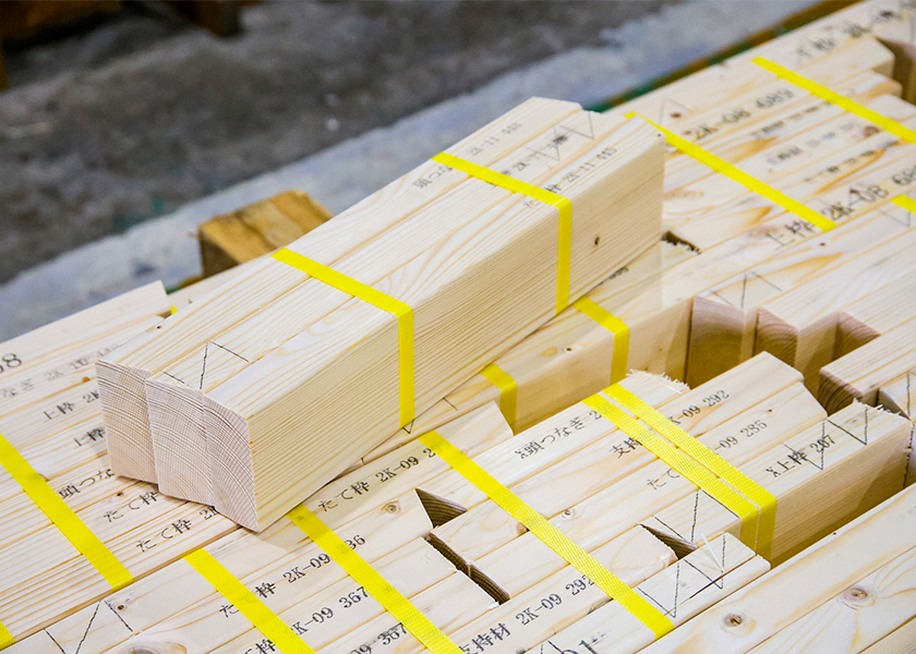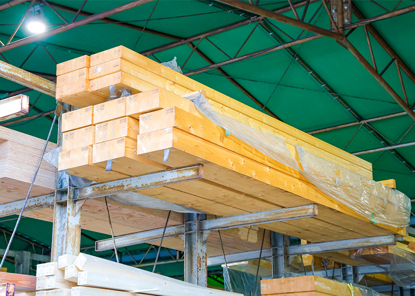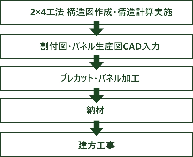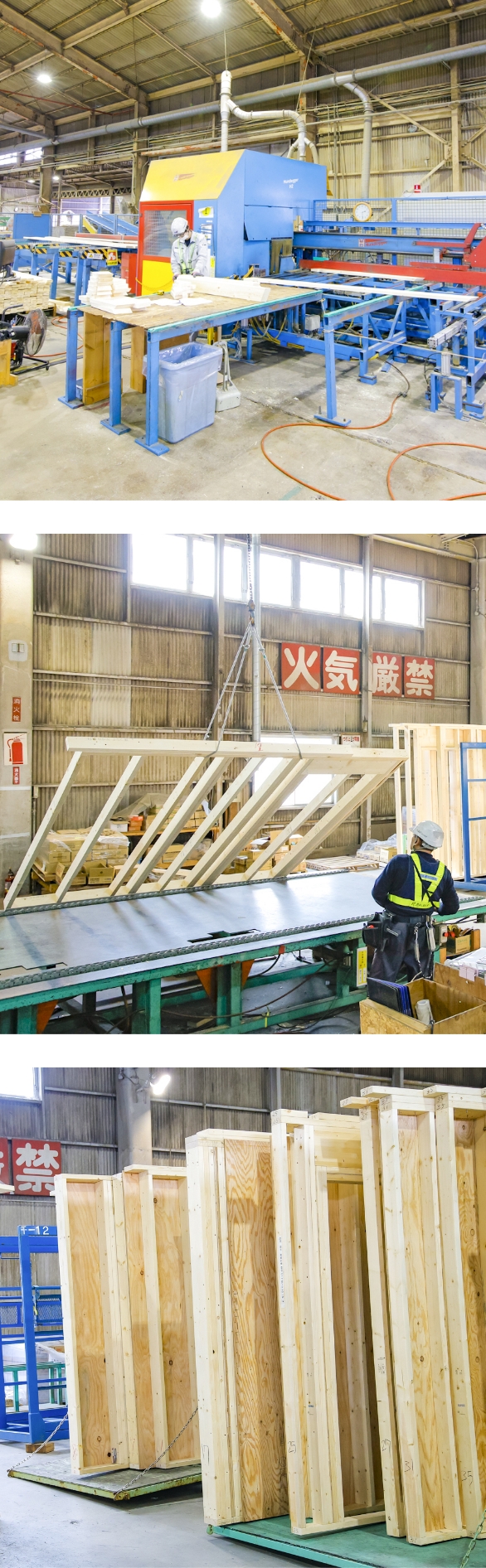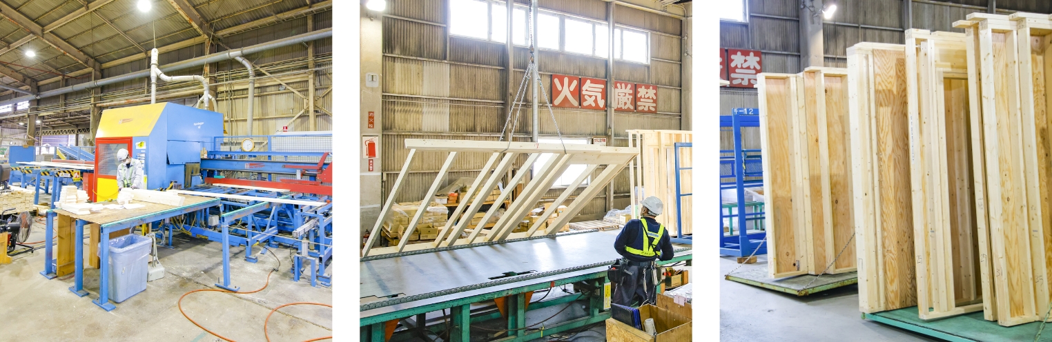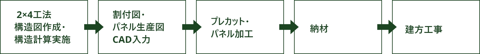 当事業部では、ツーバイフォー(2×4)工法で使用する構造材を、プレカット加工・パネル加工をして施工現場にお届けしております。プレカット加工とは、工場で土台・壁・床・小屋など、お客様のご要望に合わせた必要寸法にカットし、部位別に加工することです。また、床・壁・天井・小屋に対応したパネル加工も行っております。
