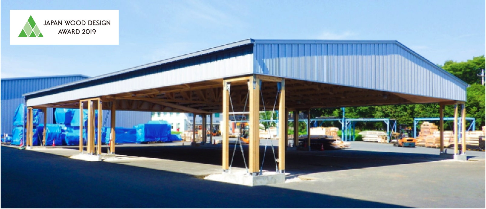 『スマート倉庫』は、地球環境にやさしい木材(一般流通規格製材である枠組壁工法用製材)を使用した木造軸組工法の平屋簡易型倉庫です。従来、荷捌場をはじめとする製品の一時仮置場や外部作業場などに利用される簡易型倉庫は、主に鉄骨テント倉庫が主流でしたが、大雪や台風など天候に合わせたテント地の取り外しや一般的に10年ごとに必要な張替作業が負担になっていました。『スマート倉庫』は、従来の倉庫にはない強度とメンテナンス性を有している点が高く評価され、2018年度にグッドデザイン賞、2019年度にウッドデザイン賞 林野著庁長官賞を受賞しています。